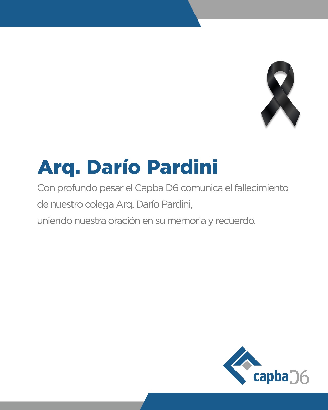 Con profundo pesar, el Capba D6 comunica el fallecimiento de nuestro Colega Arq. Darío Pardini, uniendo nuestra oración en su memoria y recuerdo, ofreciendo a su Familia y Allegados, nuestras […]