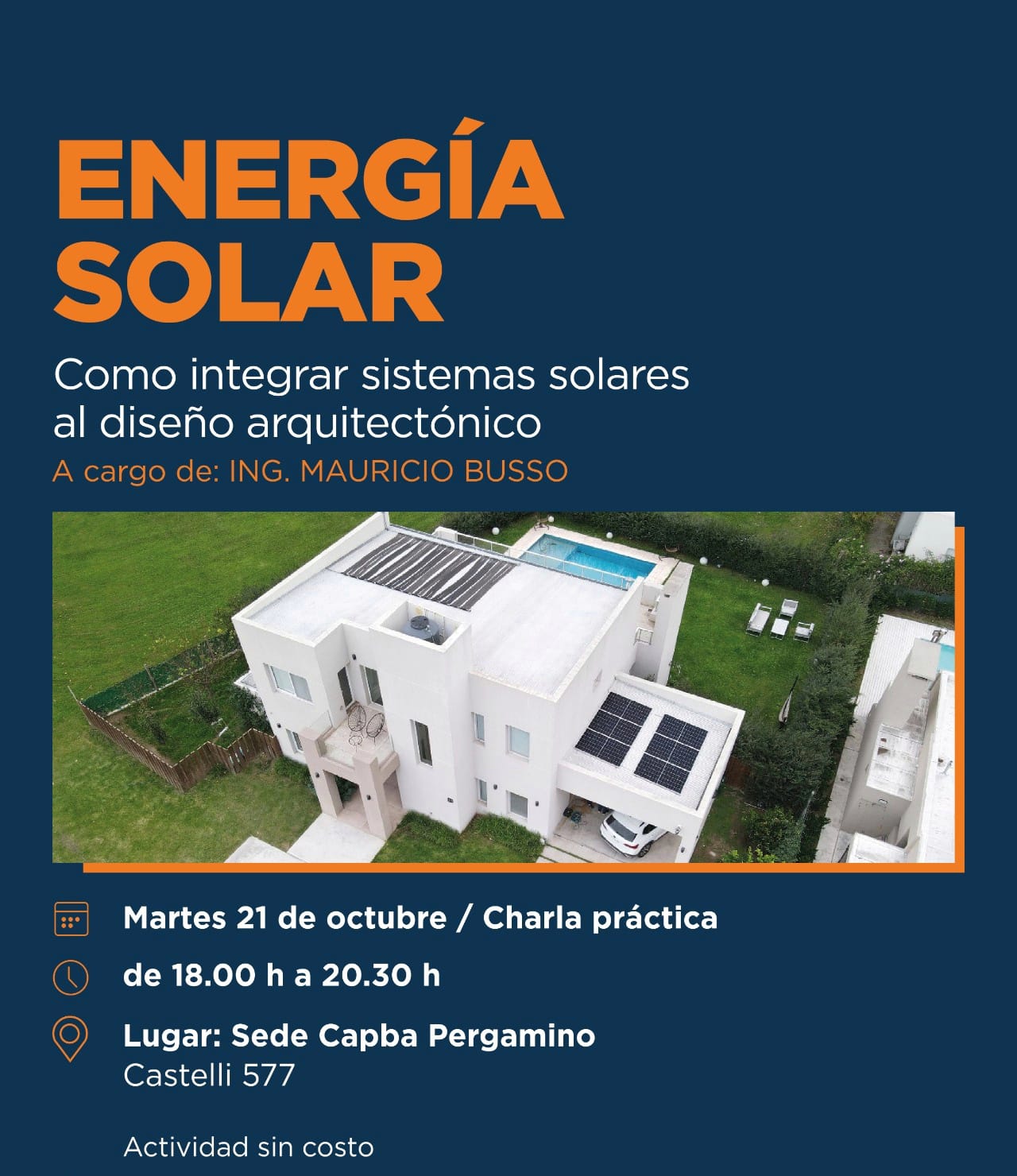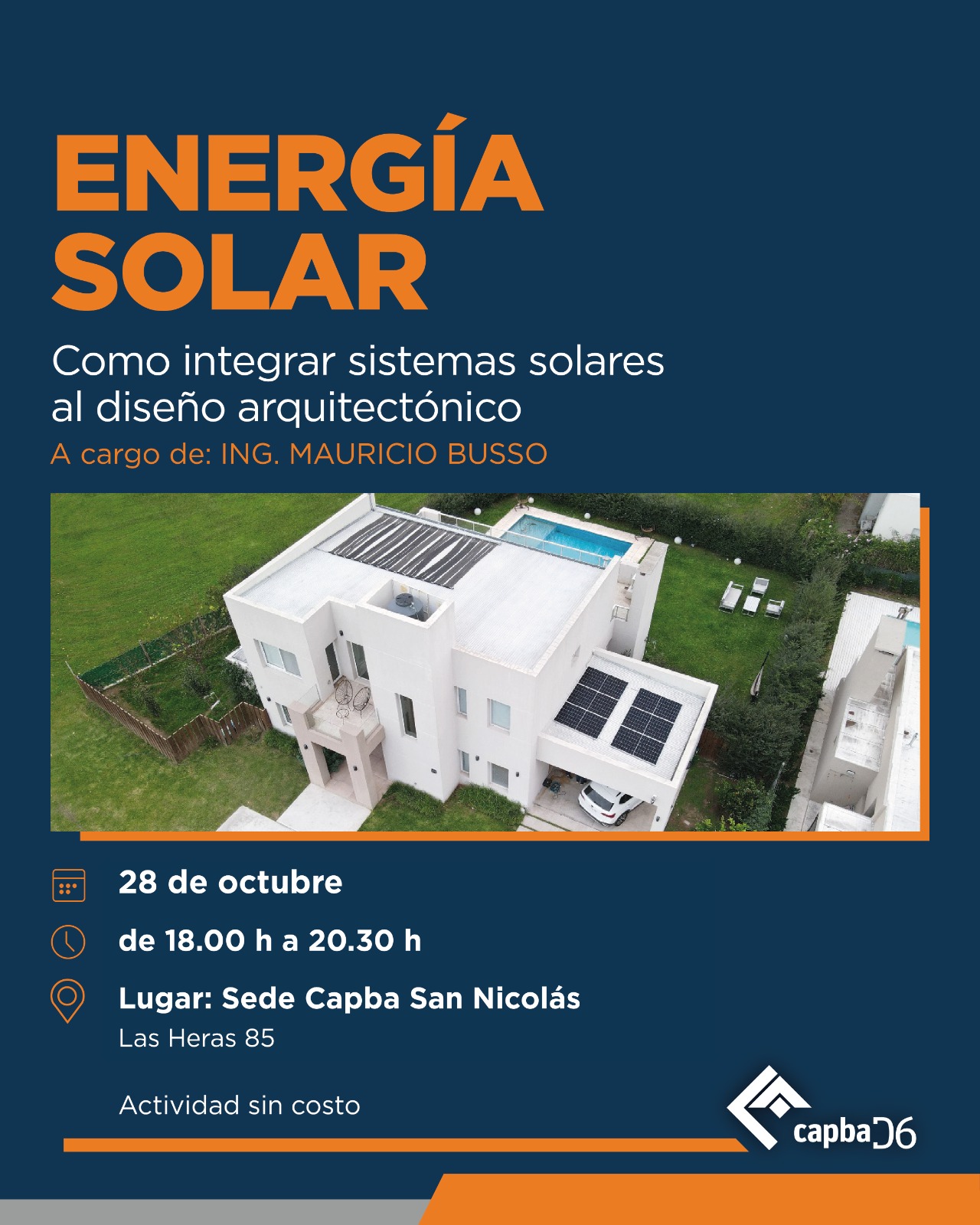 Cómo integrar sistemas solares al diseño arquitectónico A cargo del Ing. Mauricio BussoMartes 28 de octubrede 18.00 h a 20.30 hSede CAPBA San Nicolás – Las Heras 85Actividad sin costo